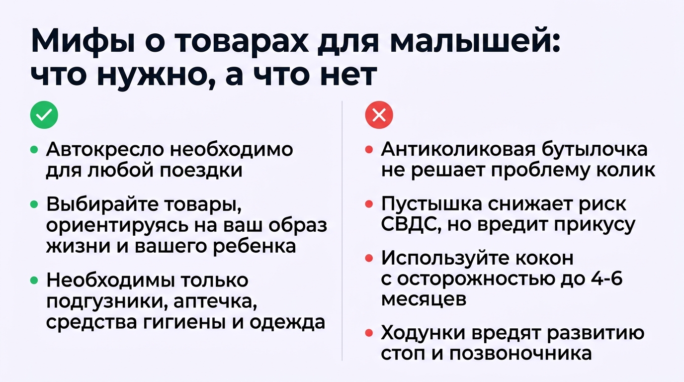 Рождение ребёнка — это всегда новый, неизведанный мир для родителей. В этой атмосфере неопределённости часто появляются мифы о том, что обязательно нужно купить малышу, без чего он якобы «не будет правильно развиваться». Нередко такие истории активно поддерживаются производителями, которые хотят продать свой товар.