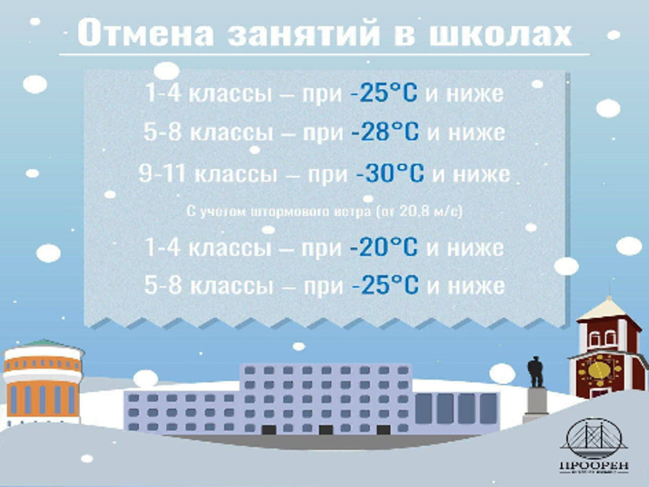 - 1-4 классы: занятия отменяются при температуре -25°С и ниже.
