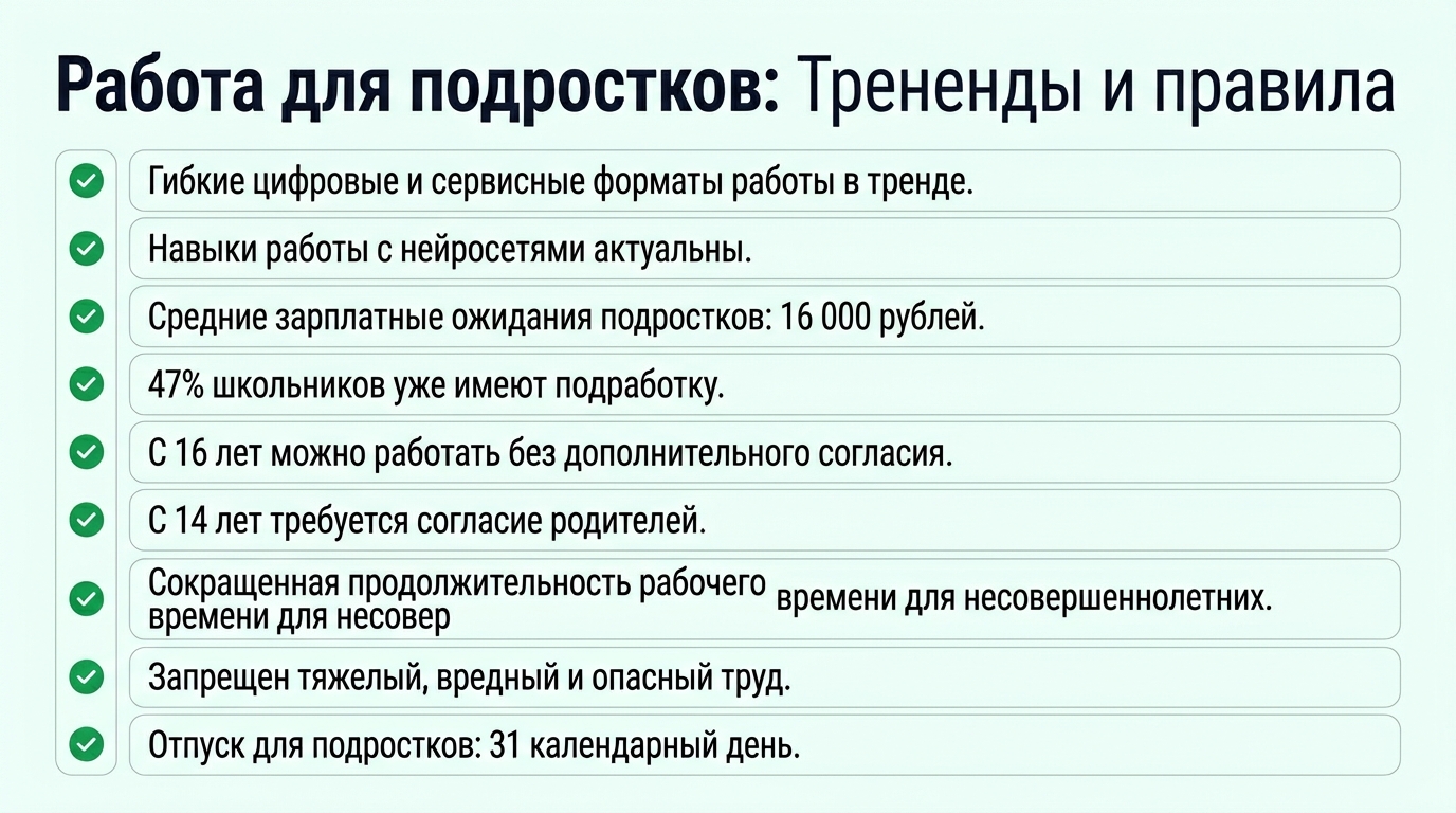 - **С 14 лет:** требуется письменное согласие одного из родителей (попечителя) и разрешение органа опеки и попечительства. Работа должна выполняться в свободное от учёбы время.