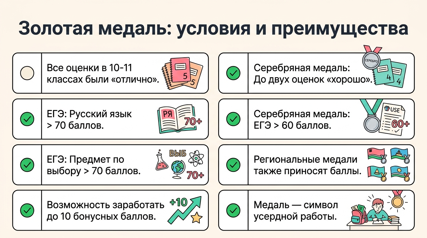 Золотая медаль — это не просто красивая награда, но и реальный инструмент, который может помочь при поступлении. За неё можно получить до 10 дополнительных баллов к результатам ЕГЭ.