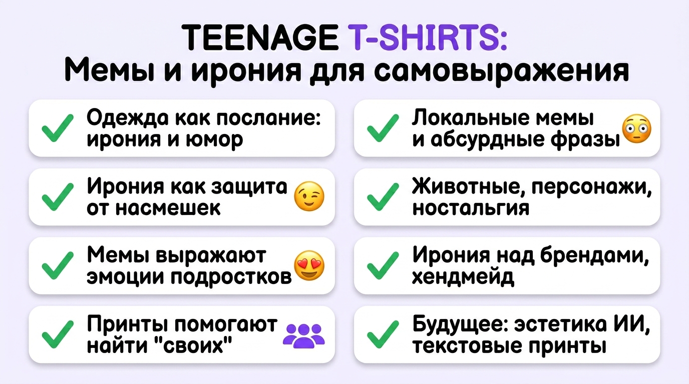 Выбор принта — это тонкое искусство, где грань между «нелепо» и «круто» очень зыбкая. Для нас, родителей, важно не только помочь ребёнку сориентироваться, но и понять, что стоит за его выбором. Между подростками и взрослыми часто возникает «поколенческий разрыв» в понимании цифрового сленга и ироничного юмора. Вместо того чтобы осуждать, попробуйте проявить интерес и расшифровать эти культурные коды.