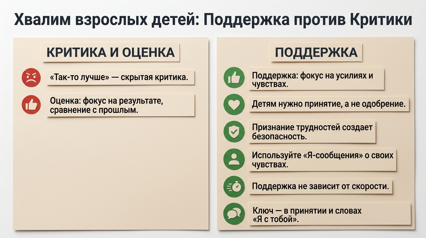 Истинная поддержка строится на двух важных принципах: принятии и стабильности. Взрослым детям, как и маленьким, нужно не столько одобрение их действий, сколько принятие их самих.