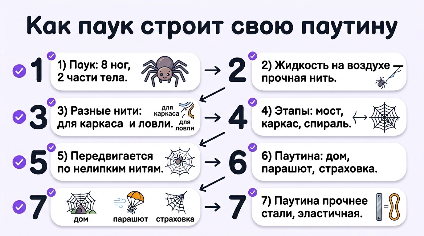 Паук — это настоящая живая «ткацкая фабрика». Если присмотреться к его брюшку (можно на картинке), там видны маленькие бугорки — это паутинные бородавки. Через них паук выпускает особую жидкость, которая на воздухе мгновенно застывает и превращается в невероятно прочную нить.