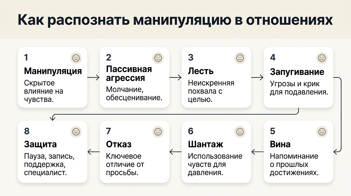 Помните, что манипуляция — это всегда скрытая попытка контролировать вас, используя ваши чувства. Здоровые отношения строятся на уважении и возможности сказать «нет» без страха последствий. Умение распознавать такие приёмы, как пассивная агрессия, лесть, запугивание, внушение вины или эмоциональный шантаж, поможет вам защитить свои границы.