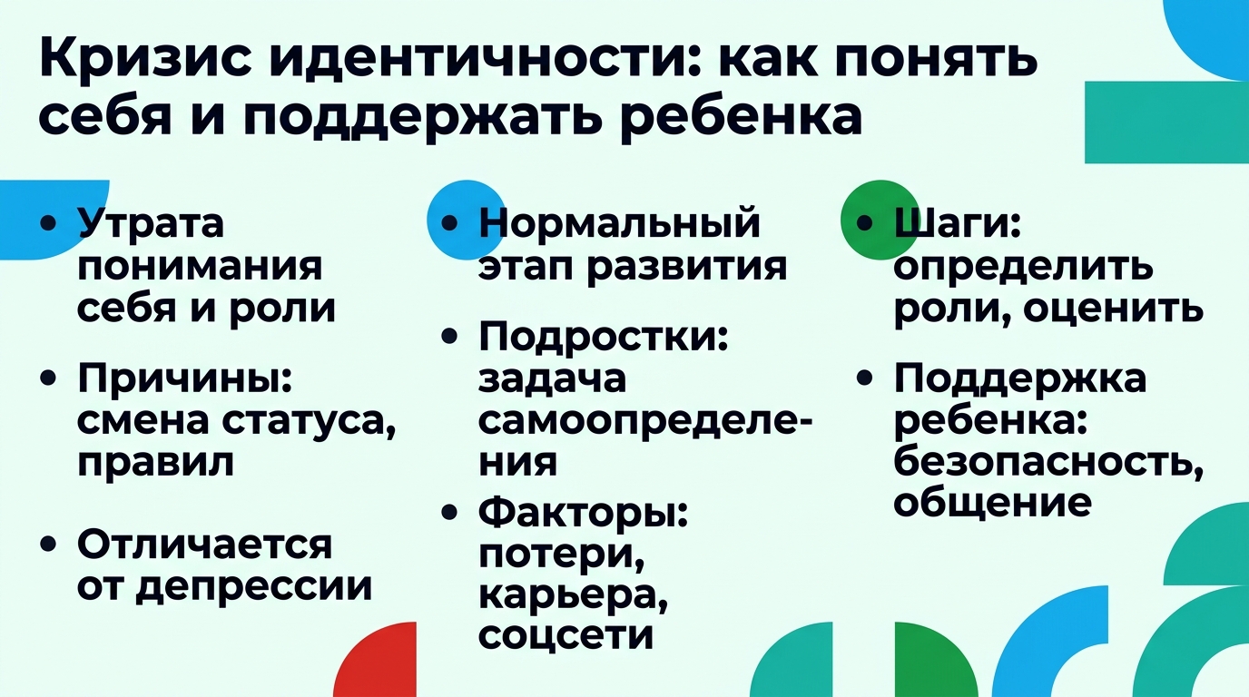 Родители играют ключевую роль в том, как ребёнок или подросток проходит через кризис идентичности. Ваша поддержка может помочь ему сформировать сильное чувство собственного «Я» и высокую самооценку: