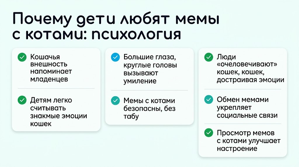 - Отсутствие табу. В отличие от мемов с людьми, кошачьи картинки редко содержат жестокость, политические темы или нецензурную лексику. Родители обычно не запрещают такой контент, что формирует у ребёнка позитивную ассоциацию с котиками и интернетом.