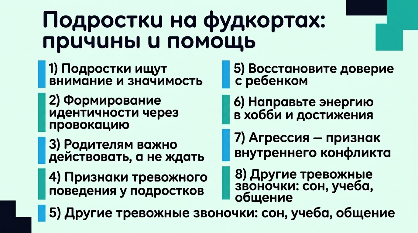 Психологи отмечают, что вызывающее поведение подростков — это не что-то из ряда вон выходящее. Напротив, это часть важного этапа в жизни каждого человека — формирования собственной идентичности. Раньше подростки собирались во дворах или в подъездах, а сегодня для этих целей часто выбирают фудкорты торговых центров. Здесь они пробуют себя в разных ролях, ищут свои ориентиры и пытаются понять, кто они есть.