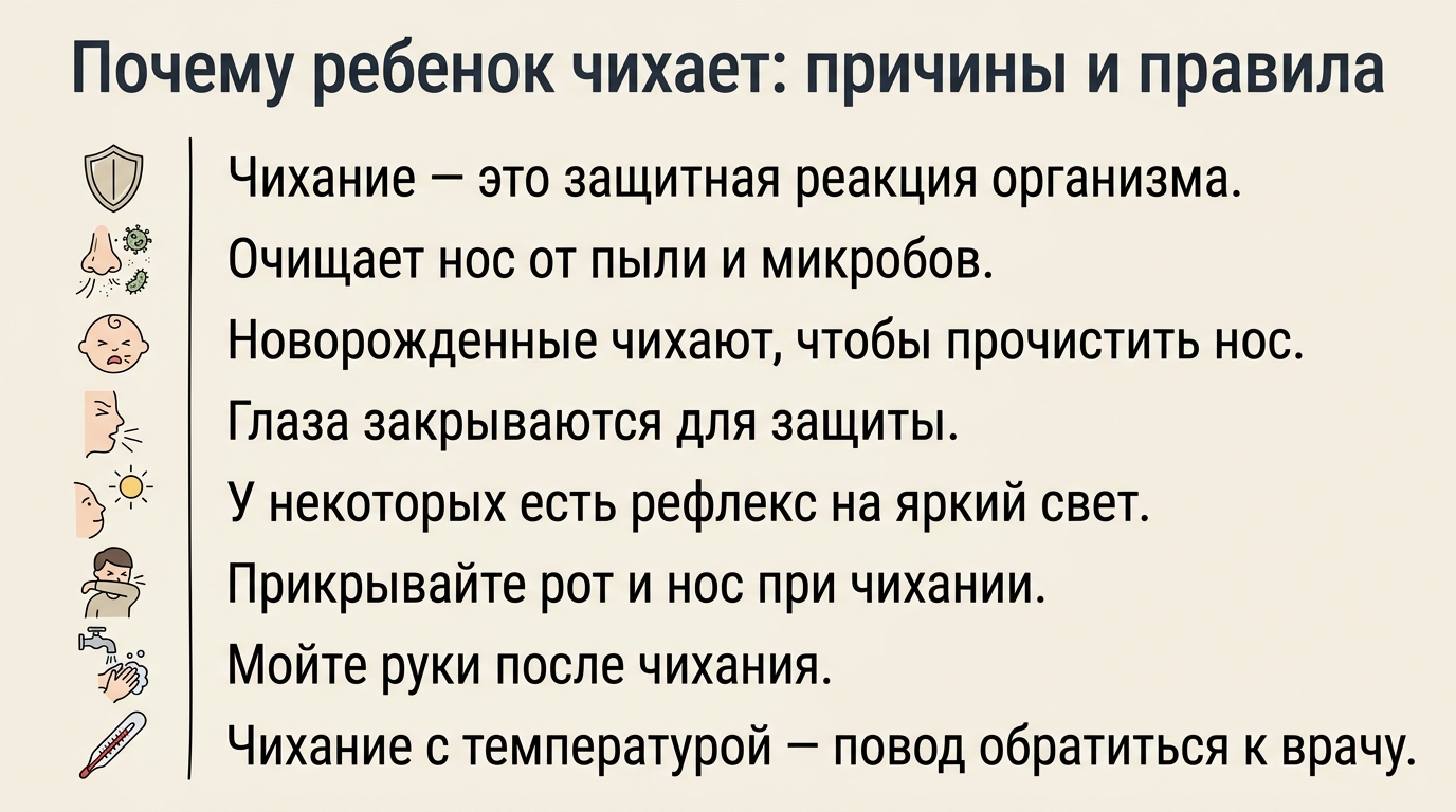 Чаще всего чихание — это нормальная реакция организма. Однако, если оно сопровождается другими симптомами, стоит обратить внимание. Например, если у ребёнка поднялась температура, появился насморк, кашель, боль в горле, он чувствует усталость или ему трудно дышать, это может указывать на простуду, грипп, аллергию или другую респираторную инфекцию. В таких случаях лучше обратиться к врачу.