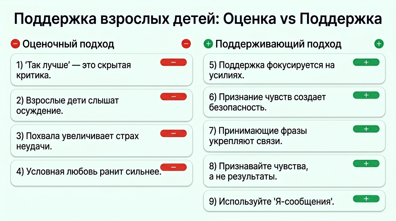 Взрослые дети, особенно те, кто переживает непростой период — будь то поиск работы, личные кризисы или важные перемены в жизни — находятся в уязвимом состоянии. Они и без того полны сомнений: правильно ли я поступаю? Не разочаровал ли я родителей? Справлюсь ли я?