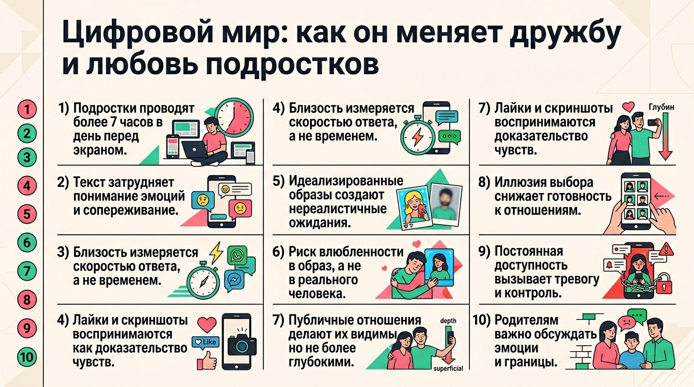 Эксперты сходятся во мнении: технологии сами по себе не разрушают дружбу и любовь. Всё зависит от того, как люди ими пользуются. Главная задача взрослых — помочь подросткам сформировать здоровые представления об отношениях. Американская академия педиатрии (AAP) отмечает, что интенсивное использование социальных сетей связано с повышенным риском депрессии, тревоги, нарушений сна, пищевых расстройств и низкой самооценки у подростков из-за постоянного социального сравнения и кибербуллинга.