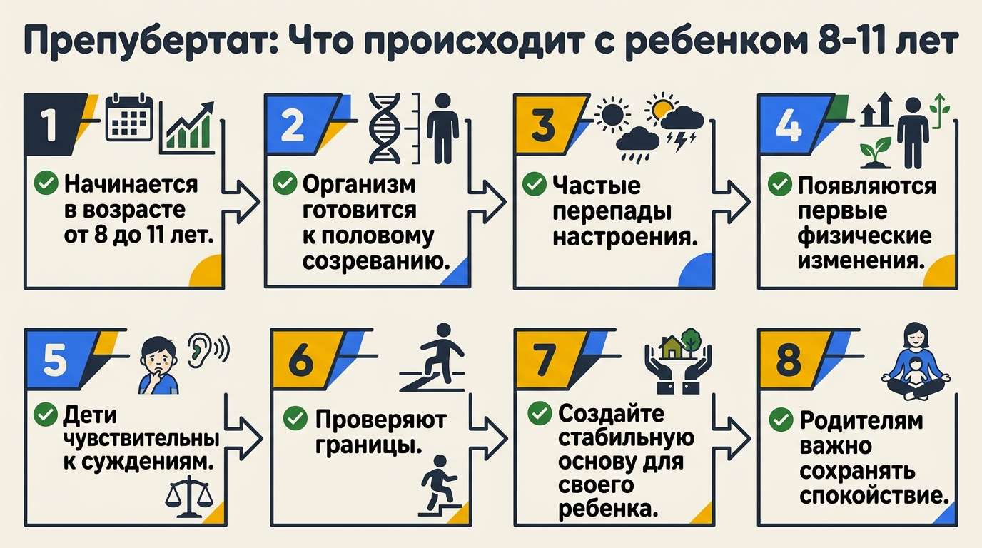 Препубертат — это время больших перемен, как для ребёнка, так и для всей семьи. Понимание этих процессов и готовность к открытому диалогу помогут не только пройти этот период мягче, но и заложить крепкий фундамент доверия, который станет опорой в более сложном подростковом возрасте.