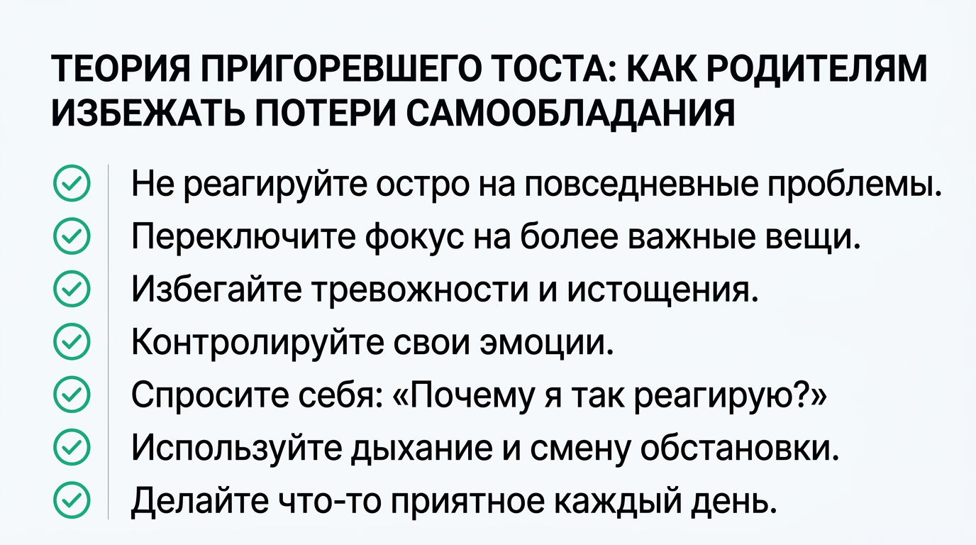 В последнее время в сети набирает популярность концепция «подгоревшего тоста». Она предлагает взглянуть на бытовые неприятности под другим углом и научиться не драматизировать их. Это особенно важно для родителей, ведь спокойствие взрослого напрямую влияет на атмосферу в семье.