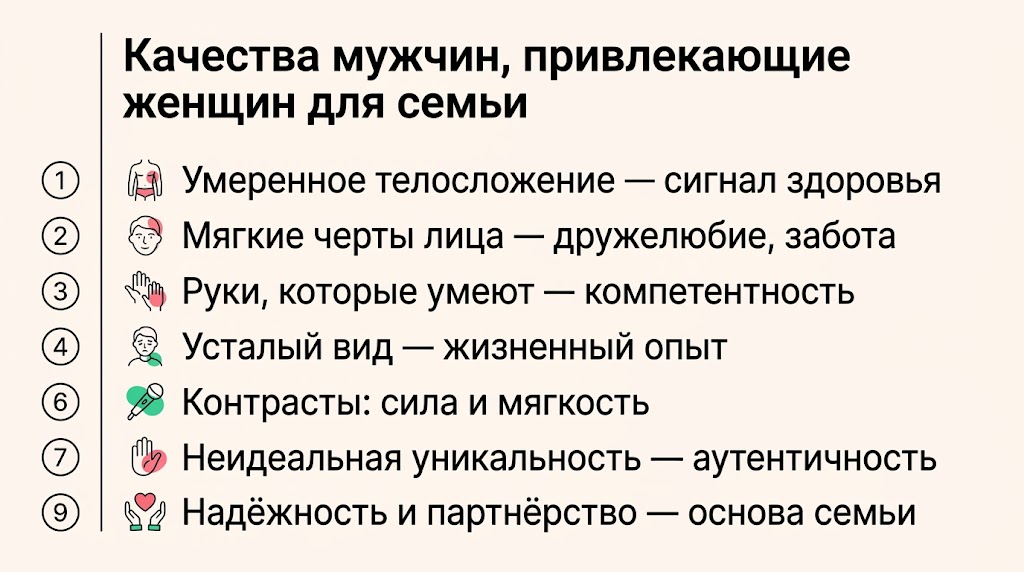 Все эти наблюдения и исследования сходятся в одном: женщины подсознательно ищут в мужчине сигналы надёжности, жизненного опыта и способности к партнёрству. Эти качества, такие как доброта, интеллект, эмоциональная стабильность и надёжность, часто являются более значимыми для устойчивого удовлетворения отношениями, чем чисто физическая привлекательность.