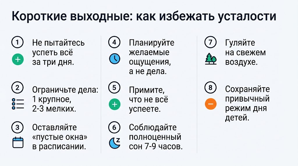 Главная причина усталости — попытка уместить в несколько дней слишком много дел. Кажется, что за три дня можно успеть всё: выспаться, съездить на дачу, посадить огород, пожарить шашлыки, встретиться с друзьями, сходить в кино, отвезти детей в парк, сделать генеральную уборку и разобрать шкаф. Список желаний растёт, а время летит. В итоге мы не отдыхаем, а переключаемся с одной задачи на другую в режиме постоянной спешки.