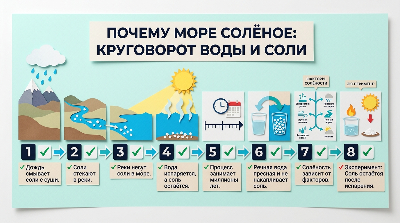 Море же можно представить как огромную чашу, куда стекаются тысячи рек со всего мира. Вода из этой «чаши» постоянно испаряется под воздействием солнца, а все растворённые в ней вещества, включая соль, остаются. Это похоже на то, как если бы вы постоянно доливали в кастрюлю немного подсоленной воды и варили суп. Вода выкипает, а соль остаётся — и суп становится всё солонее.