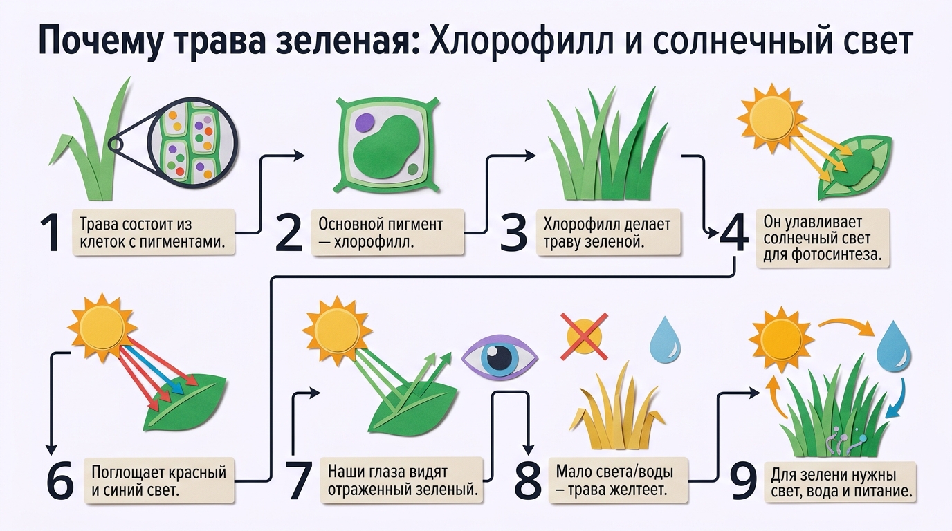 Солнечный свет состоит из множества цветов, как радуга. Хлорофилл очень любит красный и синий свет — он поглощает их, чтобы получить энергию для фотосинтеза. А вот зелёный свет ему не нужен, поэтому он его просто отражает. Наши глаза улавливают именно этот отражённый зелёный цвет, и поэтому трава кажется нам такой яркой.