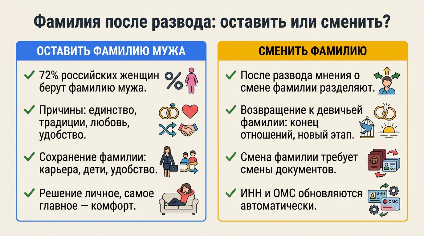 Иногда решение сохранить фамилию бывшего супруга после развода оказывается более взвешенным и продуманным, чем эмоциональное желание всё вернуть «как было». Фамилия — это прежде всего ваш идентификатор в социуме, и её смена может повлечь за собой множество неудобств.
