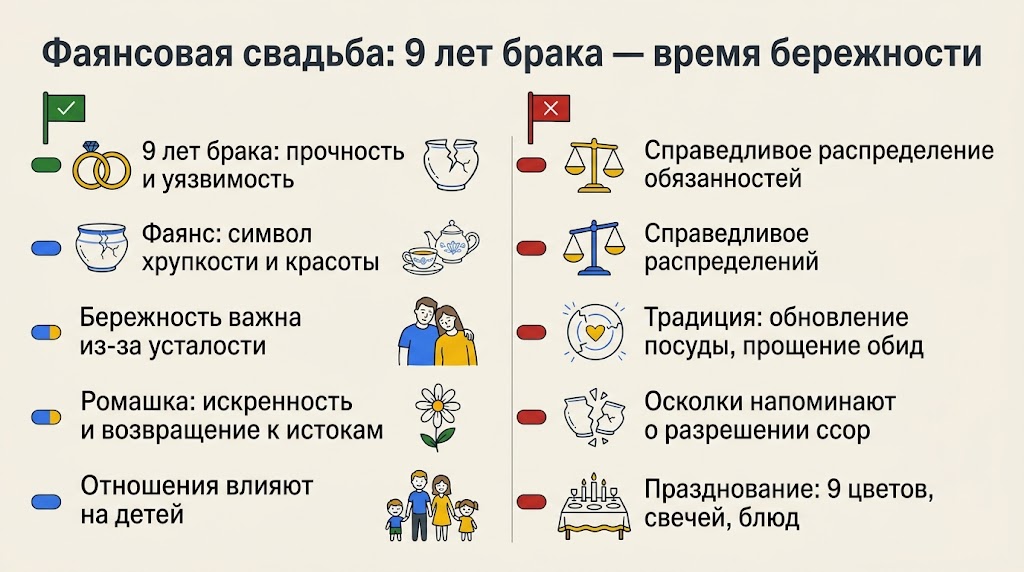 Девять лет совместной жизни — это важная дата, которая символизирует устойчивость отношений, но при этом напоминает об их хрупкости. Фаянсовая свадьба — это призыв быть одновременно крепкими и бережными друг к другу.