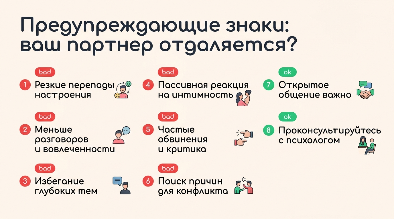 Иногда изменения в поведении партнера могут быть едва заметными, но со временем они становятся всё очевиднее. Эти сигналы не всегда означают немедленный разрыв, но они точно говорят о том, что в отношениях что-то не так и пора обратить на это внимание.