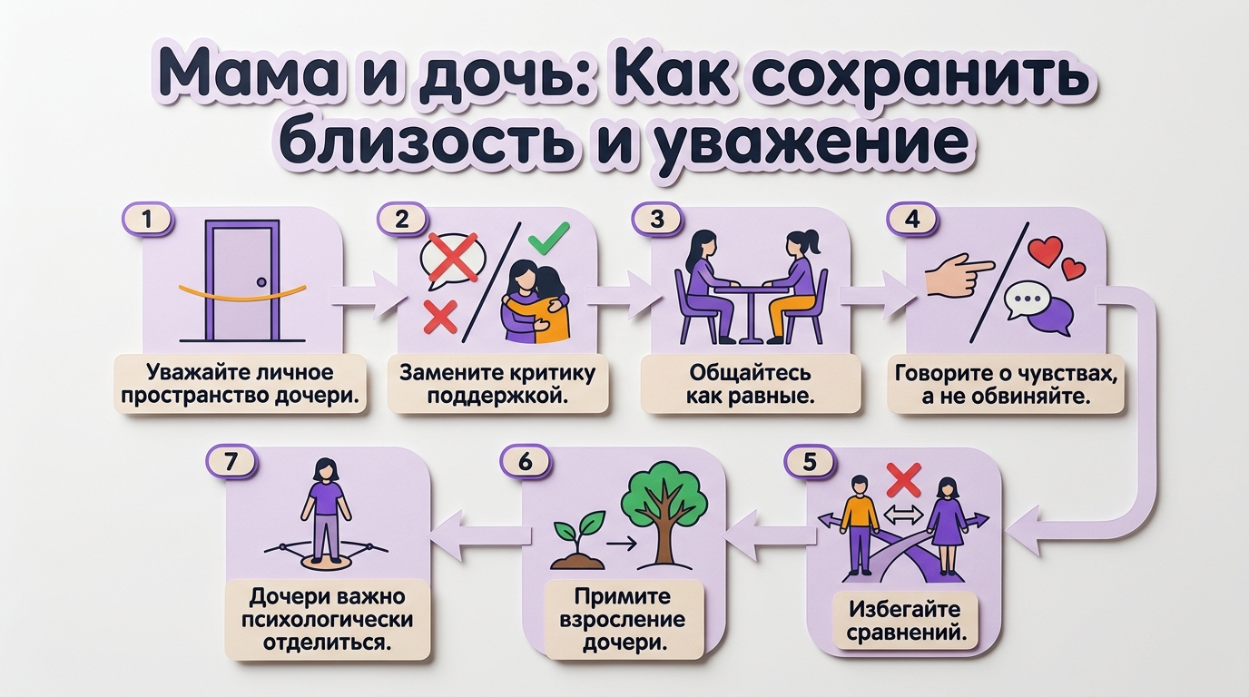 Маме стоит избегать фраз вроде «А вот я в твои годы…» или «А вот у Лены дочка…». Мир изменился, и это нормально. Дочери тоже не нужно сравнивать методы воспитания мамы с советами блогеров. Главное — не пытаться «подправить» жизнь дочери, а быть рядом и поддержать, если ей это нужно. Помните, что поддерживающие и равноправные отношения — это источник эмоциональной поддержки и повышения самооценки для обеих сторон.