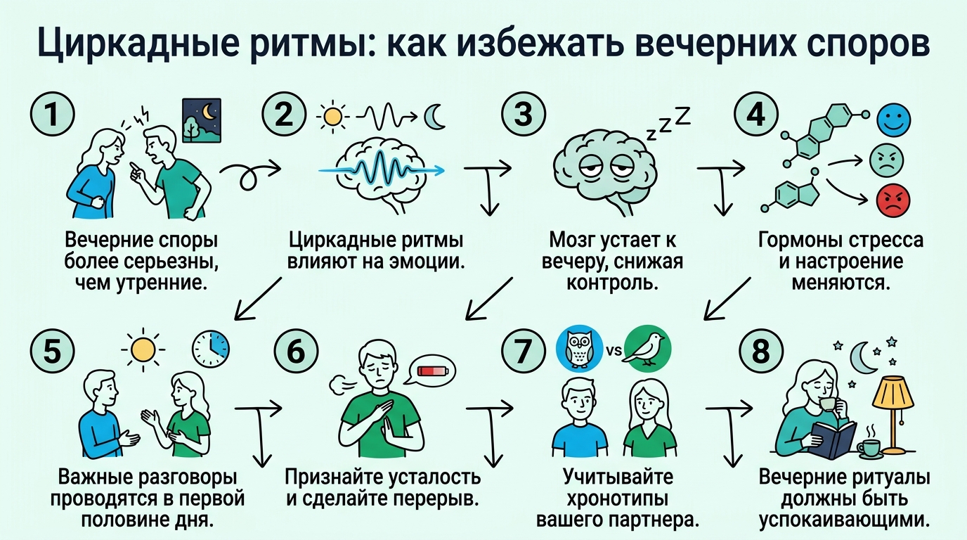 Наша способность контролировать эмоции напрямую зависит от циркадных ритмов, и вечером она минимальна. Миф «не ложись спать злым» может вредить, поскольку попытки решить конфликт в уставшем состоянии только усугубляют его. Лучшее время для важных разговоров — первая половина дня, а осознанная пауза работает гораздо лучше, чем принудительное примирение.