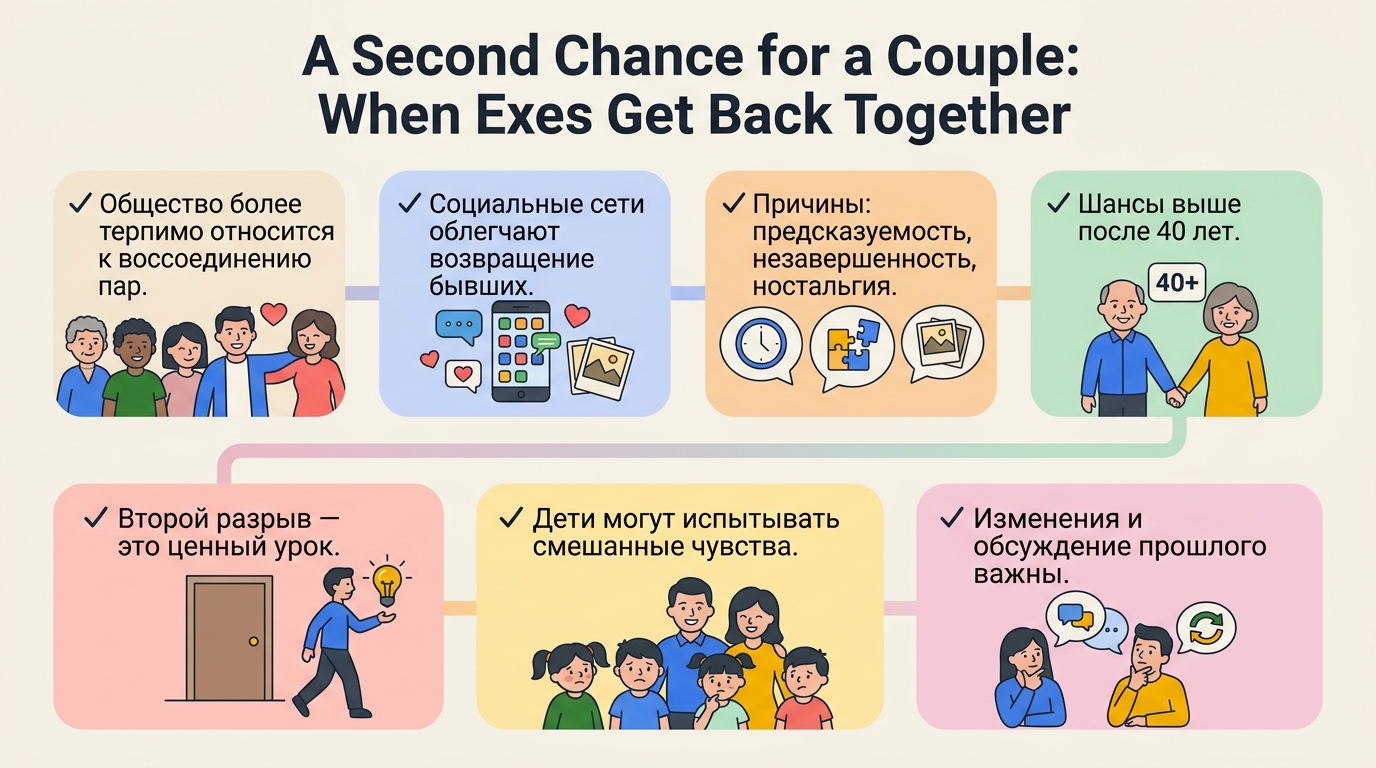 Воссоединение — это не просто возвращение к прошлому, а создание нового будущего. Оно требует осознанности, честности и готовности работать над собой и отношениями. Главное — помнить, что каждый опыт, удачный или нет, даёт ценные уроки и помогает лучше понять себя и свои истинные желания. А для детей самое важное — стабильность и любовь, которую они чувствуют в семье, независимо от её формы.