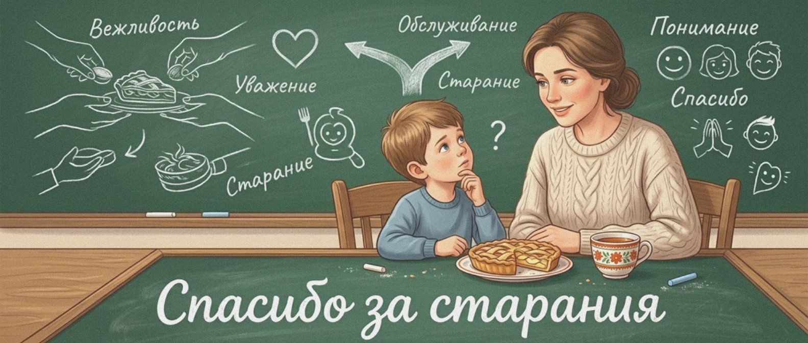 Даже в таких случаях лучше начать с благодарности за усилия: «Спасибо, что старалась! В следующий раз, может, добавишь побольше варенья? Оно такое вкусное!» Вежливость — это не ложь, а умение не ранить человека, который хотел сделать вам приятное. Когда мы выражаем благодарность за усилия, мы даём человеку почувствовать себя ценным, и это мотивирует его продолжать проявлять заботу и доброту.