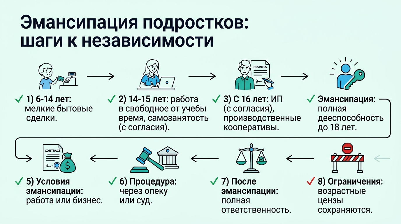 Главное отличие эмансипации от простого согласия на бизнес: после эмансипации подросток сам несёт полную имущественную ответственность по своим обязательствам. Родители уже не несут субсидиарной ответственности по его сделкам, за исключением вреда, причинённого до эмансипации.