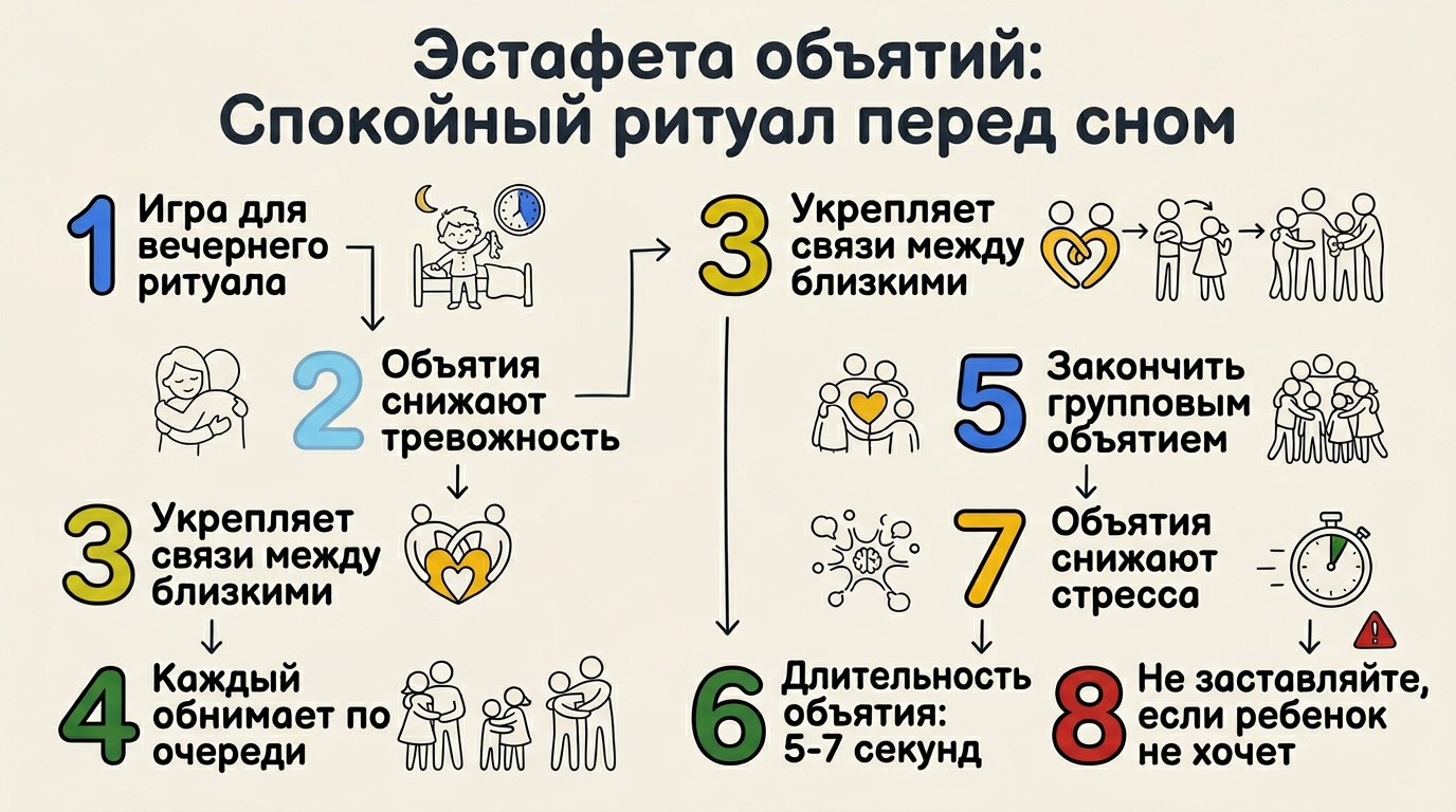 «Эстафета объятий» — это простая и тёплая игра, которая может стать прекрасным вечерним ритуалом для всей семьи. Она помогает снять напряжение, дарит чувство безопасности и укрепляет связь между близкими.