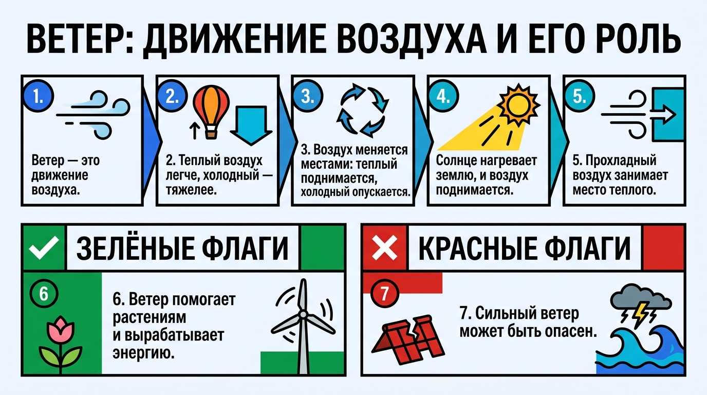 Можно объяснить ребёнку так: «Представь, что в комнате стало очень душно. Ты открываешь окно, и свежий, прохладный воздух с улицы сразу же врывается внутрь, выталкивая тёплый воздух наружу. Это воздух „поменялся местами“. Точно так же происходит и на улице: там, где воздух сильно нагрелся, он „убегает“ вверх, а на его место приходит холодный. Поэтому мы и чувствуем ветер».