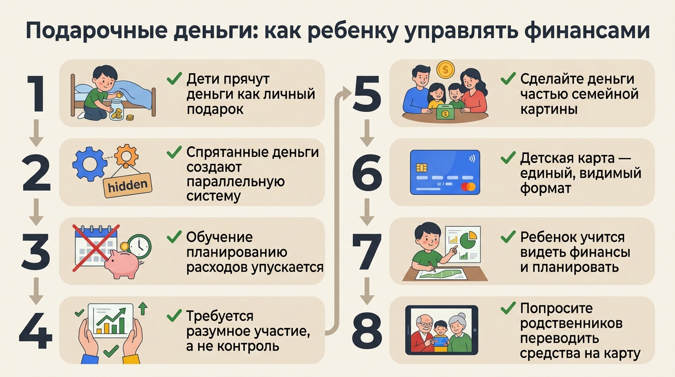 Речь не идёт о том, чтобы отслеживать каждую покупку или запрещать тратить подаренные деньги на «что попало». Цель в том, чтобы эти средства перестали быть «чёрным ящиком» и стали частью общей, понятной для семьи финансовой картины. Для этого важно заранее договориться с родственниками о формате дарения и объяснить ребёнку, что подарок — это его деньги, но их использование обсуждается в семье, как и любые другие финансовые вопросы.