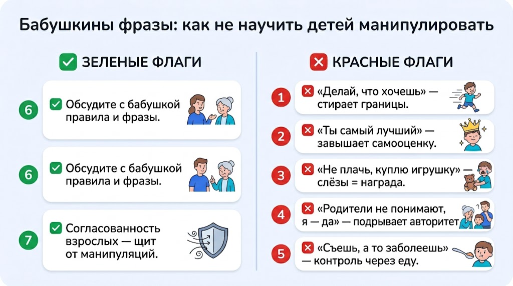 Поговорите с бабушкой о том, какие слова лучше не использовать (например, «делай, что хочешь»), какие границы важны для семьи (например, «мы не даём сладкое перед обедом») и как реагировать на манипуляции (например, если внук плачет из-за игрушки, просто обнимите его, но не покупайте).