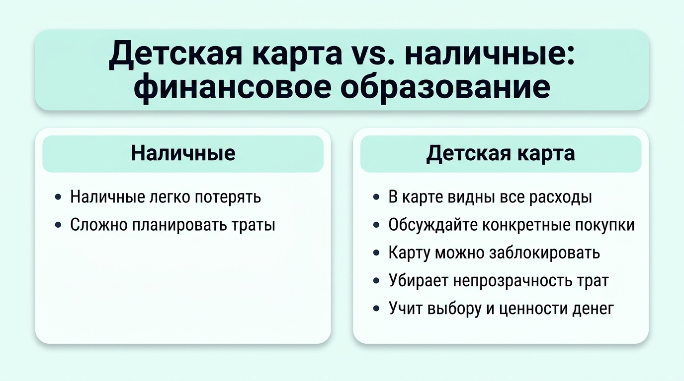 Если цель родителей — не просто дать ребёнку деньги на буфет, а научить его финансовой грамотности, то детская дебетовая карта становится гораздо более удобным инструментом. В отличие от наличных, которые исчезают бесследно, карта даёт полную картину трат.