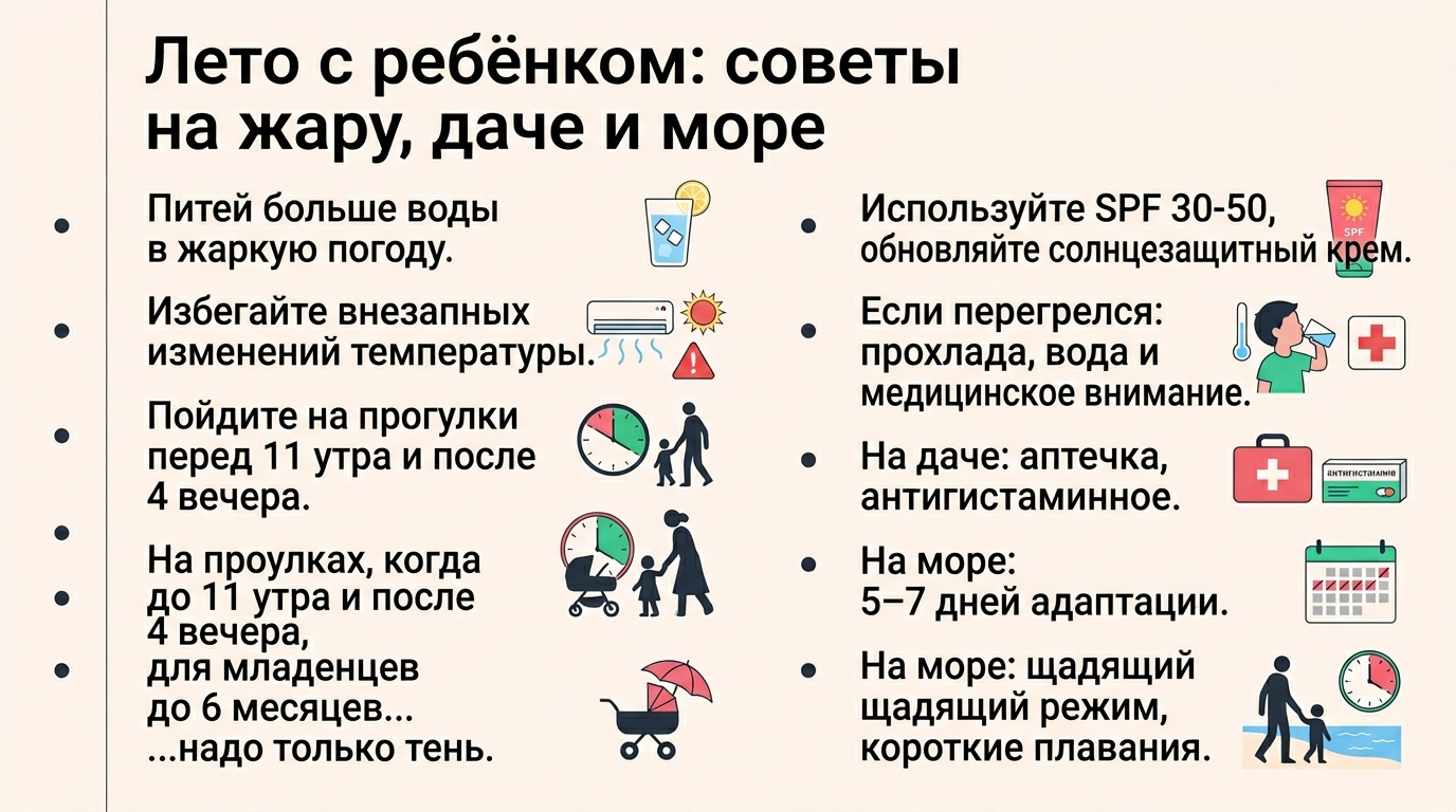 Лето — прекрасное время для укрепления здоровья и новых впечатлений. С правильной подготовкой и вниманием к деталям вы сможете обеспечить ребёнку безопасный и радостный отдых, будь то в городе, на даче или у моря.