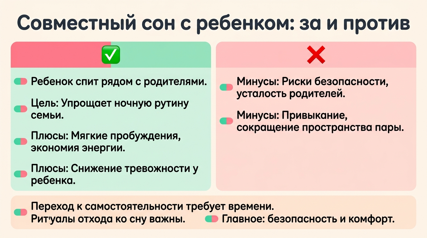 Трудности возникают не из-за самого совместного сна, а из-за резких изменений. Если привычная система сна внезапно исчезает, ребёнок может реагировать протестом, потому что теряет привычную опору.